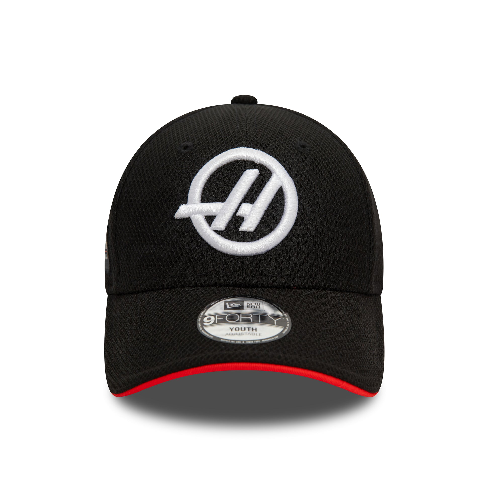 Haas F1 Team cap for the kids, as worn by the Haas Formula One Team during the 2024 F1 World Championship. Made by and featuring the New Era flag.