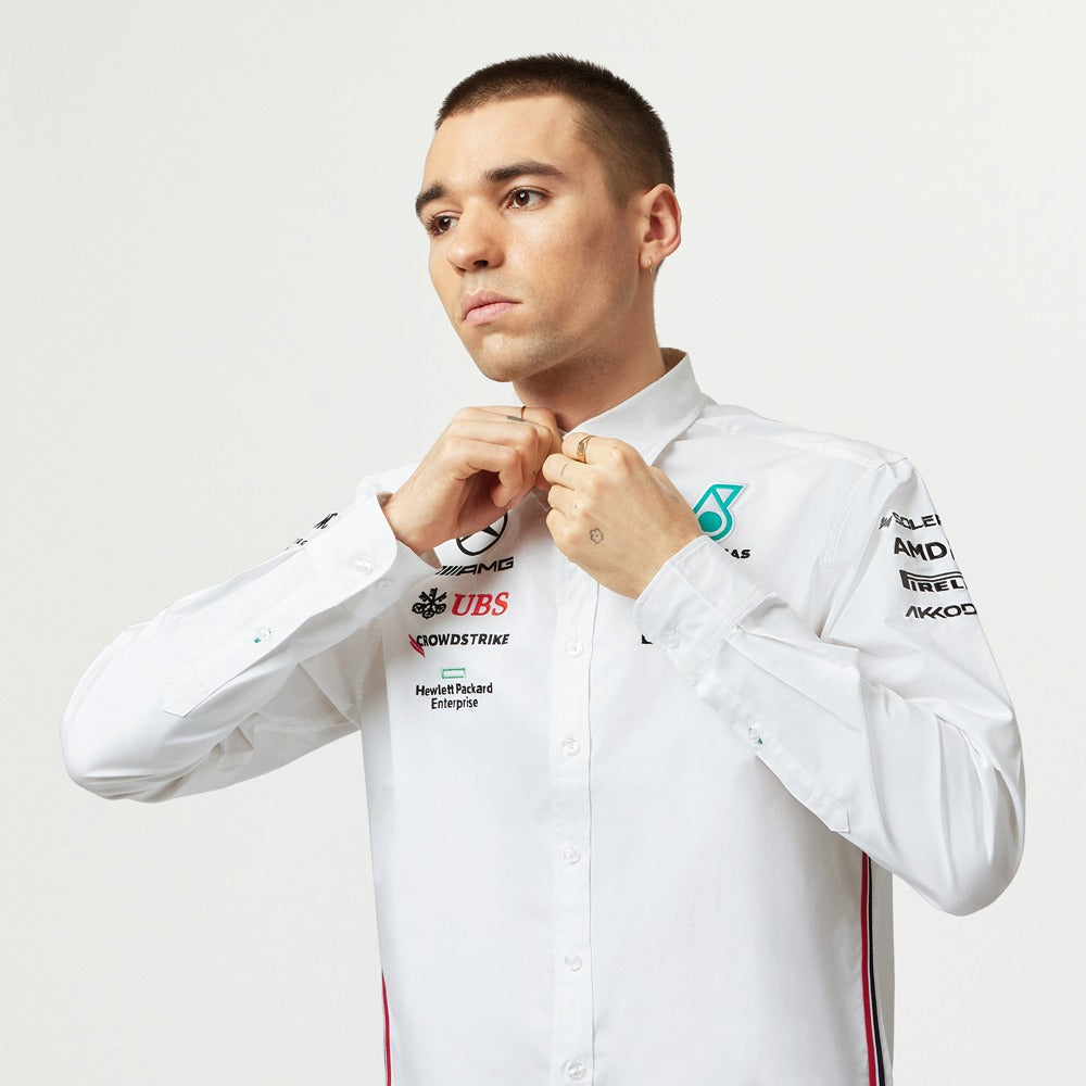 We call this 'The Toto' - you too can now get the big boss look with this official Mercedes AMG Petronas F1 Team shirt, now available for the first time with long sleeves. Team and partner logos. Made from 96% cotton and 4% Elastine for that extra stretch of comfort. Has a chest pocket.