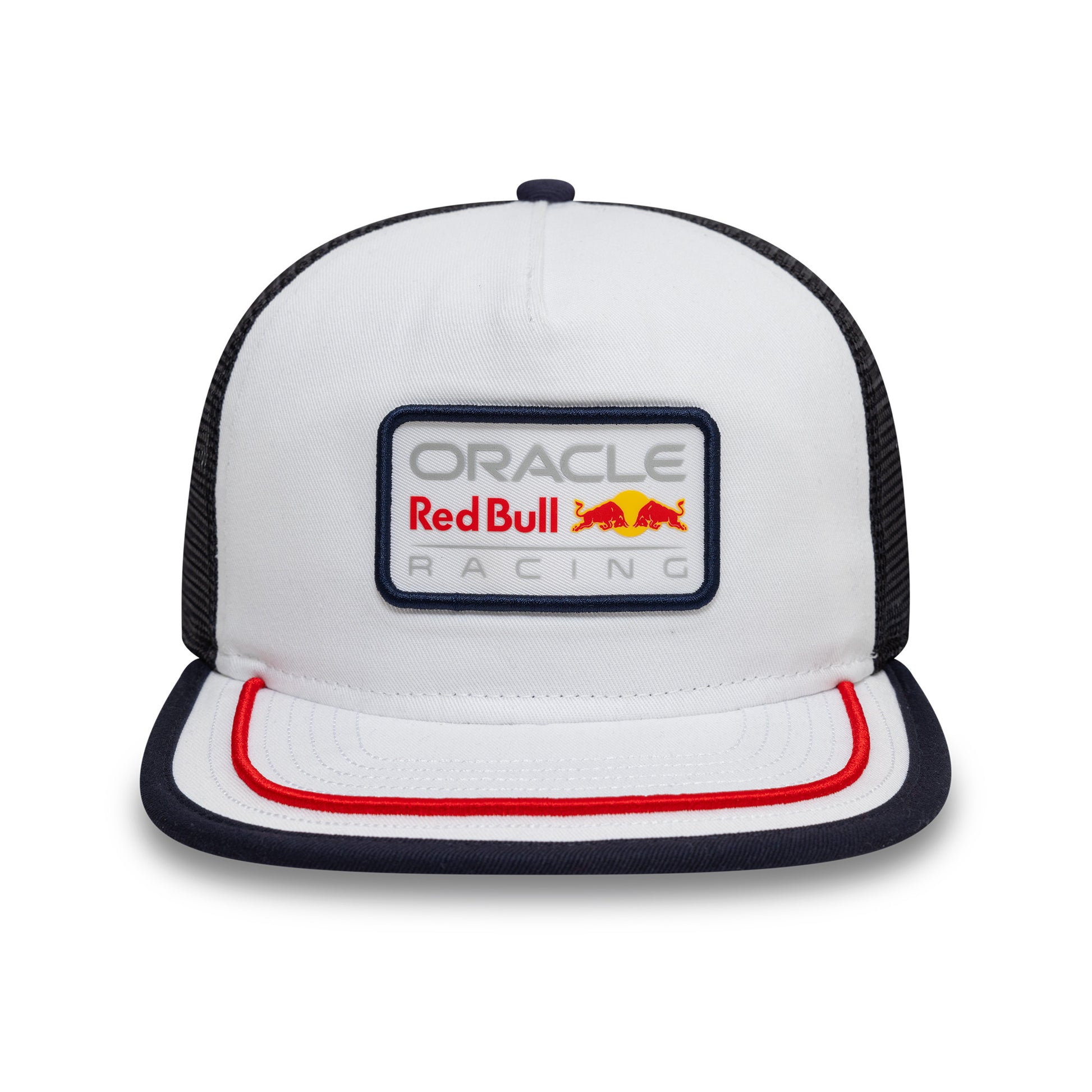 Retro golfer cap from Red Bull F1 Team. Oracle Red Bull Racing Team logo patch, contrast trucker mesh and stripe detailing on the peak.